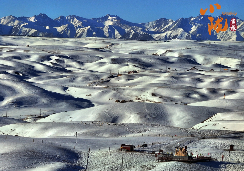 藍天如洗,鋪滿白雪的草原,與群山相映,蒼茫無際,呈現出安然素美的意境。
