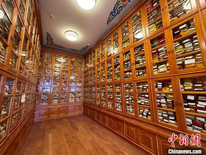 2月28日,修繕后的拉卜楞寺藏經(jīng)樓內(nèi),所藏古籍文獻(xiàn)整齊擺放于新書架上。中新社記者 丁思 攝