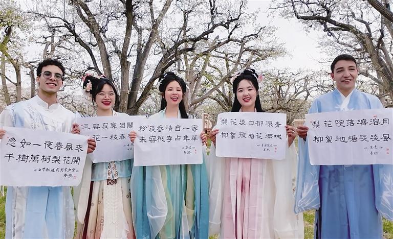 在接下來的詩詞互動環(huán)節(jié),外籍留學(xué)生開啟換裝模式,身著漢服,徜徉在梨花樹下,吟誦著“梨花”主題的詩句,感受中國漢服之美和中國傳統(tǒng)文化的魅力。換裝后的外籍留學(xué)生也讓梨園秒變“出片現(xiàn)場”。“這是我第一次穿漢服,穿著漢服在梨園里拍的照片真的很好看。”來自越南的黃青草,迫不及待地想把這份梨園的浪漫春日記憶分享給自己的同學(xué)、朋友。