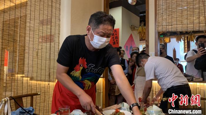 趙亮現(xiàn)場給食客展示如何炒制一鍋美味的柴火雞?!『武?nbsp;攝