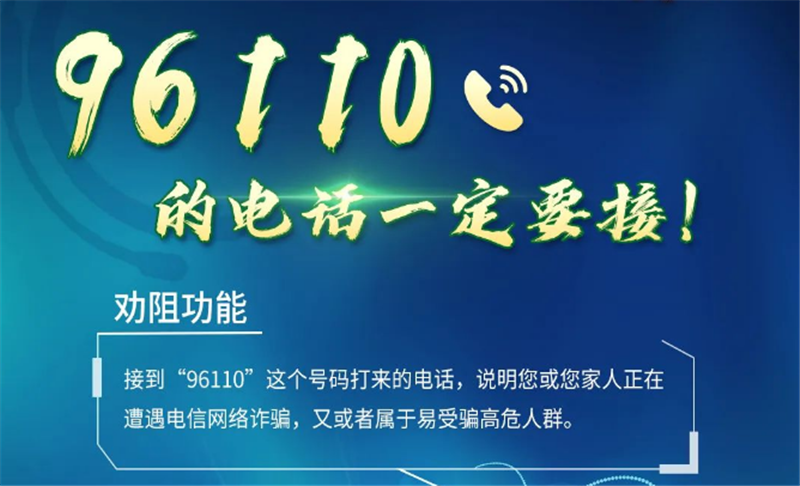公安機(jī)關(guān)提醒:96110是官方預(yù)警勸阻專線,如接到“96110”號(hào)碼來電,說明機(jī)主本人或其家人正遭遇電信網(wǎng)絡(luò)詐騙,請(qǐng)一定及時(shí)接聽并耐心聽取民警的勸阻提示,避免上當(dāng)受騙。