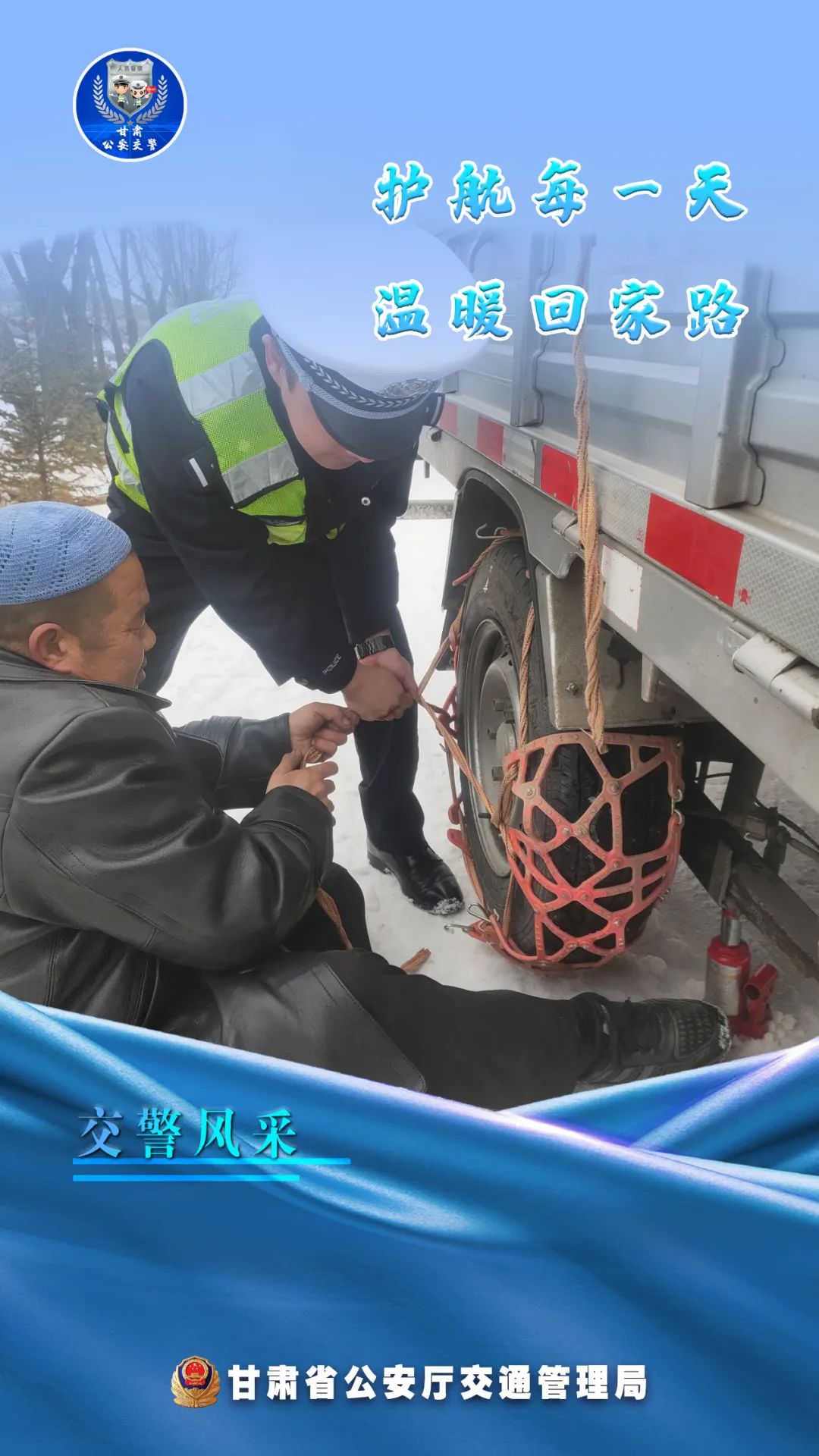 定西公安交警幫助駕駛員給車輛捆綁防滑鏈,最大限度確保雪天駕駛安全