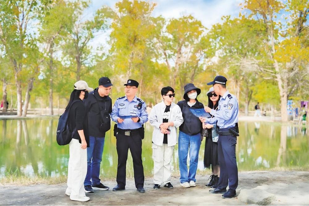 同時(shí),運(yùn)用智慧警務(wù)加強(qiáng)對景區(qū)人流量的動(dòng)態(tài)掌握,適時(shí)調(diào)整巡防策略,在林區(qū)、夜市、游樂場等關(guān)鍵部位,民輔警利用大喇叭播報(bào)安全提示、面對面宣講等方式,有針對性開展防火防盜、交通安全、預(yù)防電詐等安全知識宣傳,向游客傳播“胡楊精神”、講好金塔故事,用“零距離”服務(wù)、全時(shí)空守護(hù)提升游客獲得感、幸福感和滿意度。