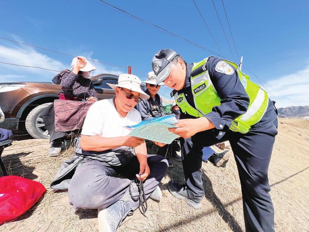 民輔警向群眾講解交通安全知識(shí)。近日,碌曲縣公安局交警大隊(duì)民輔警借助夏澤灘春季賽馬活動(dòng)有利時(shí)機(jī),開(kāi)展“美麗鄉(xiāng)村行”交通安全巡回宣傳活動(dòng)。 新甘肅·甘肅法治報(bào)記者金凡裕攝