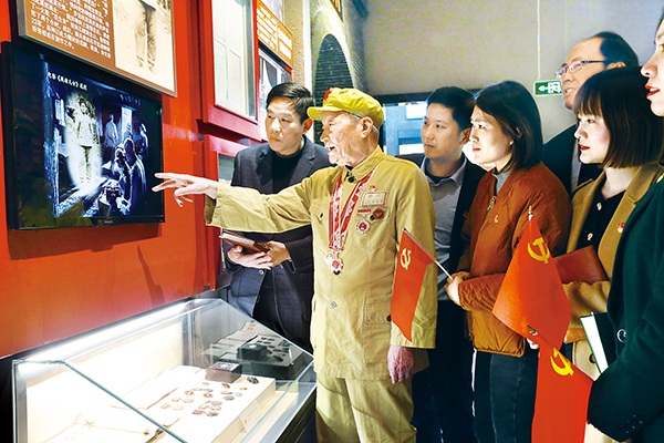 圖為江蘇省宜興市紀(jì)檢監(jiān)察干部參觀黨史陳列館,聆聽有65年黨齡的老黨員講述抗戰(zhàn)經(jīng)歷。鄒宜賓 攝