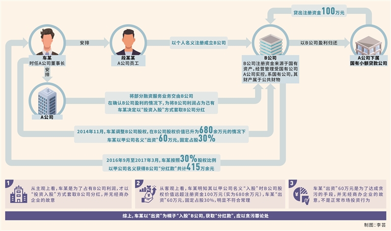 第二,車某的所謂出資行為并非市場投資行為,而是其利用職務(wù)便利獲取本屬于國有公司B公司的確定性預(yù)期收益的犯罪手段。本案中,車某明知其以甲公司名義“入股”時,B公司實(shí)際資產(chǎn)高于注冊資金100萬元。經(jīng)查,在車某以甲公司名義“入股”B公司時,B公司實(shí)際股權(quán)價(jià)值為680余萬元,車某“出資”60萬元占股30%,明顯不符合常理,換言之,車某“出資”60萬元不應(yīng)獲得30%股權(quán)。車某的真實(shí)目的是在不承擔(dān)市場風(fēng)險(xiǎn)的前提下,利用擔(dān)任A公司董事長的職務(wù)便利,將A公司確定能夠盈利的融資業(yè)務(wù)交給B公司經(jīng)營,并在確認(rèn)B公司能夠盈利的情況下,以“出資”為幌子“入股”B公司,獲取“分紅款”,應(yīng)以貪污罪論處。