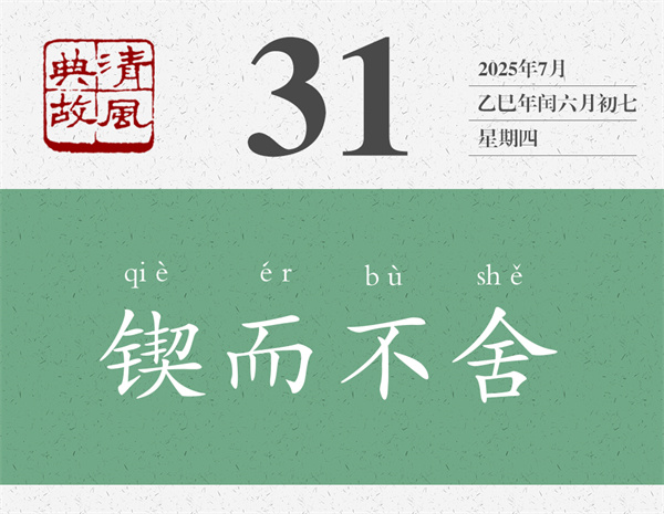這段話中,為后人貢獻(xiàn)了好幾個(gè)典故,一個(gè)是“跬步千里”,一個(gè)是“鍥而不舍”。前者從“不積跬步,無以至千里”而來,不過只是反其意而用之,意思是,只要一步一步走下去,就能達(dá)到千里之遠(yuǎn)。后者是從“鍥而不舍,金石可鏤”而來,意思非常清楚:一直雕刻而不停止,即使一塊金石也能雕刻成器。后即以“鍥而不舍”比喻有恒心,有毅力。章炳麟《菌說》:“夫固謂一人鍥而不舍,則行美于本性矣。”