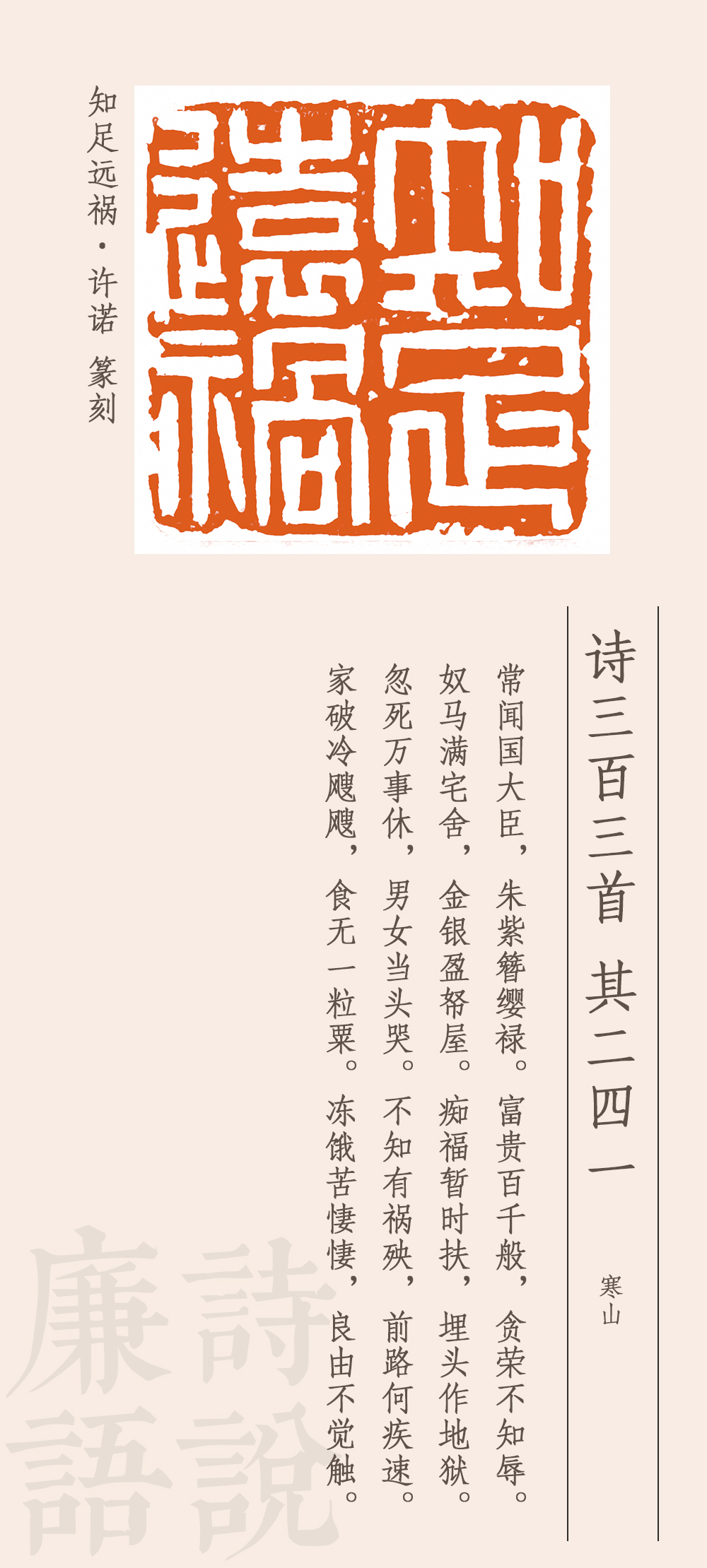 這首詩(shī)是諷刺高官貪圖富貴、聚斂財(cái)物的。他說(shuō),有些國(guó)之大臣,穿戴尊榮,好不威風(fēng),享受千般榮華富貴,卻一點(diǎn)兒都不顧及廉恥榮辱,家中擁有大量駿馬奴仆,屋子里堆滿金銀財(cái)寶,自以為這是在享福,其實(shí)是在給自己挖墳?zāi)沟鬲z。一旦死去,萬(wàn)事皆休,富貴是無(wú)法永久保留的。如果因貪腐而遭受禍殃,那下場(chǎng)就會(huì)很慘。家破人亡,挨凍受餓,凄風(fēng)苦雨,苦不堪言。最后一句卒章顯志:之所以會(huì)有這樣的遭遇和結(jié)局,是因?yàn)闆](méi)有悟透取禍的原因。這個(gè)原因從前面所述來(lái)看,就是太貪婪、不知足。