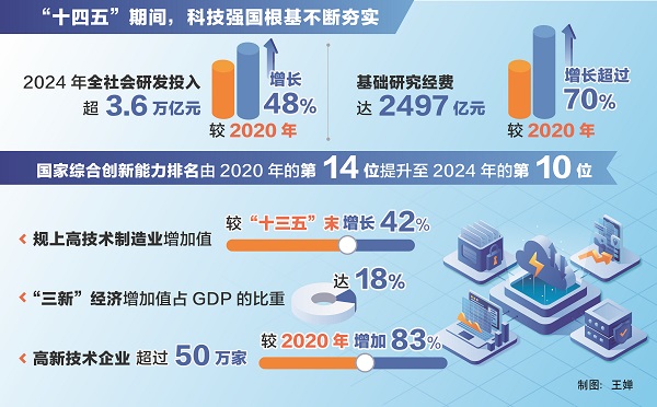 “這五年,科技創(chuàng)新能力穩(wěn)步提升,科技強(qiáng)國(guó)根基不斷夯實(shí)。”陰和俊說(shuō),我國(guó)科技投入持續(xù)增加,2024年全社會(huì)研發(fā)投入超3.6萬(wàn)億元,較2020年增長(zhǎng)48%;基礎(chǔ)研究經(jīng)費(fèi)達(dá)2497億元,較2020年增長(zhǎng)超過(guò)70%,在量子科技、生命科學(xué)、物質(zhì)科學(xué)、空間科學(xué)等領(lǐng)域取得一批重大原創(chuàng)性成果;國(guó)家實(shí)驗(yàn)室體系建設(shè)穩(wěn)步推進(jìn),國(guó)家科研機(jī)構(gòu)、高水平研究型大學(xué)科研能力不斷提升,科技領(lǐng)軍企業(yè)加快培育成長(zhǎng);北京、上海、粵港澳大灣區(qū)國(guó)際科創(chuàng)中心支撐引領(lǐng)和輻射帶動(dòng)作用不斷增強(qiáng),深圳-香港-廣州躍居全球百?gòu)?qiáng)創(chuàng)新集群榜首;國(guó)家綜合創(chuàng)新能力排名由2020年的第14位提升至2024年的第10位。