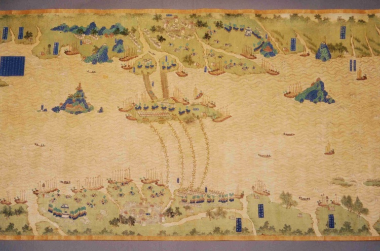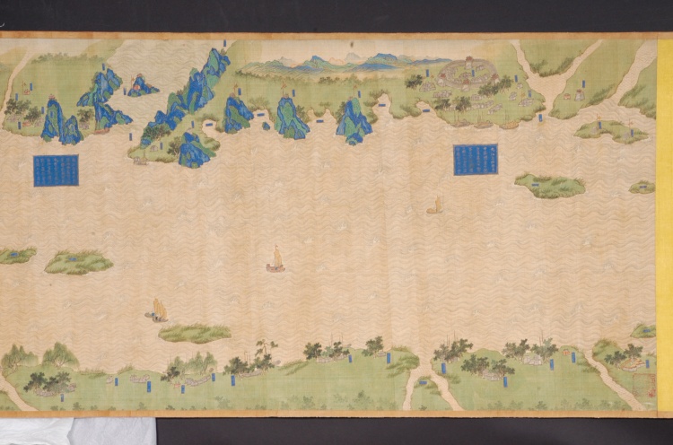 清代,縱59.7厘米,橫1340厘米。采用傳統(tǒng)技法繪制,上南下北,凡江水、港泊、洲渚、城池、村落、林木、山石、舟車、人物、旗幡、軍械均以立體形象呈現(xiàn),飾以石青、石綠等多種顏色。上起九江、下至鎮(zhèn)江,千里區(qū)域中列攔江纜、攔江牌、戰(zhàn)船、木樓、煙墩、駐軍地、營等各種軍事設(shè)施,每營均有金書大榜題,記述本營所處位置及兵力布置狀況,每汛的標題上還記有汛與汛之間的里數(shù)。