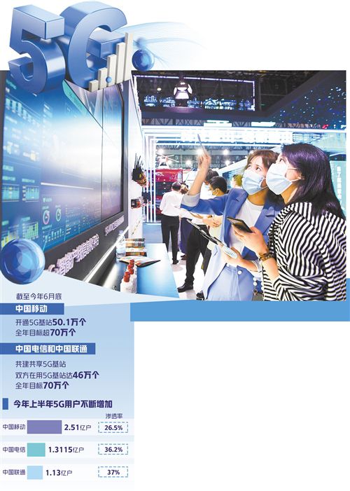 從5G基站看,截至今年6月底,中國移動已開通5G基站50.1萬個,全年目標超過70萬個;中國電信和中國聯(lián)通共建共享5G基站,目前雙方在用5G基站達46萬個,全年目標也是70萬個。工信部數(shù)據(jù)顯示,截至今年6月底,我國累計建設(shè)5G基站96.1萬個,覆蓋全國所有地級以上城市,5G手機終端連接數(shù)達3.65億戶,占全球80%以上。
