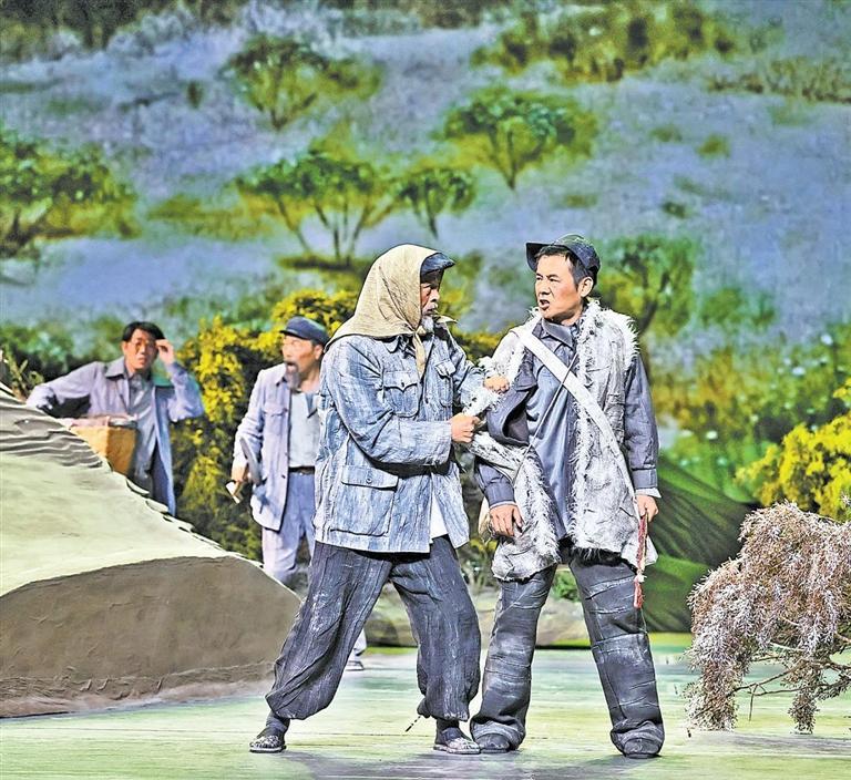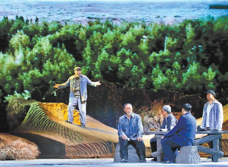 現(xiàn)實(shí)題材是話劇藝術(shù)的寵兒,在話劇進(jìn)入中國(guó)一百多年的時(shí)光中,現(xiàn)實(shí)題材創(chuàng)作占據(jù)相當(dāng)大的比例。在近當(dāng)代中國(guó)歷史的進(jìn)程中,話劇始終起著敢為天下先、針砭時(shí)弊的作用,但話劇又有其極其特殊的藝術(shù)框范。人們?cè)谟^看話劇時(shí),仿佛就是在觀看自己的人生,觀看自己和身邊最熟悉的人們,這是話劇藝術(shù)獨(dú)具的極高的審美要求。尤其是現(xiàn)代題材的創(chuàng)作,稍有不慎便會(huì)陷入同質(zhì)化的僵硬模式,使舞臺(tái)藝術(shù)失去應(yīng)有的美感。話劇《八步沙》讓6個(gè)老漢成為舞臺(tái)聚光燈下的主角,體現(xiàn)了創(chuàng)作者們呼應(yīng)時(shí)代之需,為最普通的農(nóng)民寫生立傳的拳拳之心。6個(gè)老農(nóng)民談不上人們通常意識(shí)中的“美”,“治沙”這樣的故事也相對(duì)比較單調(diào),不大容易出彩,而創(chuàng)作者們以八步沙這個(gè)真實(shí)的地名作為劇名,以“六老漢”治沙這個(gè)真實(shí)的事件作為全劇的敘述內(nèi)容,卻能宕開一筆把特定的外部環(huán)境與人物的內(nèi)心世界巧妙地融為一體,為全劇注入了濃郁飽滿的戲劇情境和情感,使這部話劇有了獨(dú)屬于自己的一份力度、一份無(wú)法替代的光彩。全劇的情節(jié)一曲三折,以小見大,當(dāng)黑壓壓的沙塵暴鋪天而來(lái)的時(shí)候,當(dāng)六老漢在嚴(yán)酷的環(huán)境中吃盡苦頭,摸索出“一棵樹,一把草,壓住沙子防風(fēng)掏”的寶貴經(jīng)驗(yàn),使漫無(wú)邊際的沙漠終于出現(xiàn)一抹綠色,繼而眼看著一棵又一棵綠樹成活成林,終于成為一片綠洲的時(shí)候,我相信觀眾的心也被藝術(shù)琴弦撥動(dòng),始終被劇情牽著走,為劇中人物的命運(yùn)擔(dān)心、懸心、痛心、開心,從中深深地感受到劇中所蘊(yùn)藏的豐富內(nèi)涵和它所傳達(dá)出的真切意趣。