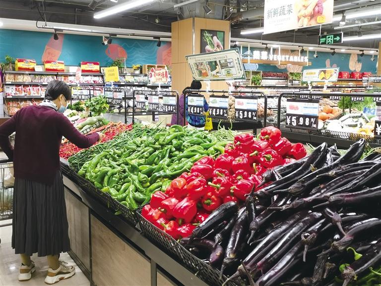 超市蔬菜、水果和肉蛋類供應(yīng)正常儲(chǔ)備充足。 蔣凌 攝