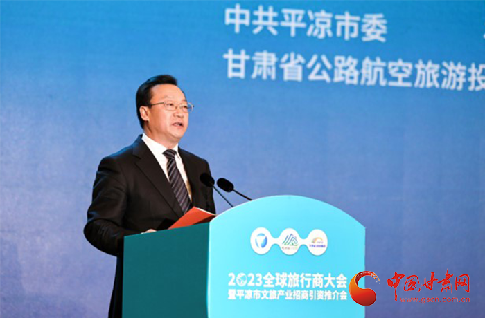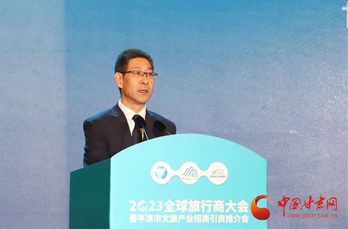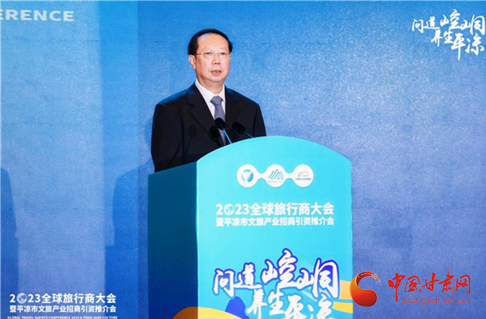 何效祖在致辭中說,平?jīng)鍪歉拭C向東開放的“門戶”城市,是風景宜人的旅游城市,是甘肅布局的文旅康養(yǎng)基地和支撐“一核三帶”區(qū)域發(fā)展格局中的重要支點,擁有崆峒山、大云寺·王母宮、瑤池溫泉等眾多聞名遐邇的人文和自然景觀。今天,我們與平?jīng)鍪形姓?、中國旅行社協(xié)會、甘肅公航旅集團一道搭建平臺,誠邀各位嘉賓走進甘肅、深入平?jīng)?,組織開展宣傳推介、洽談合作、展示展銷、考察踩線等系列活動,就是要引導大家深度感知甘肅高質(zhì)量發(fā)展的強烈愿望,實地觸摸甘肅文旅如火如荼的生動實踐,誠懇表達隴原兒女“視企業(yè)家為最寶貴財富”的真誠合作和赤誠服務之心。我們衷心希望,廣大中外旅行商和文旅專家、文旅企業(yè)家以本次大會為契機,加強交流互鑒,深化務實合作,加大在甘投資力度,組織更多游客到甘肅觀光旅游,帶動更多優(yōu)質(zhì)文旅企業(yè)和項目落戶甘肅,合力譜寫甘肅文旅高質(zhì)量發(fā)展的嶄新篇章!
