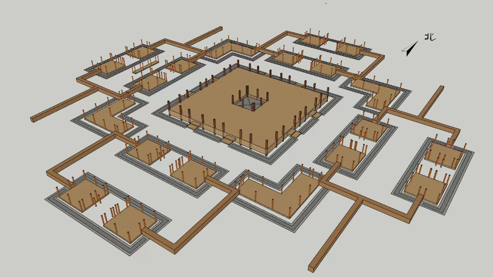 四角坪遺址考古隊領(lǐng)隊、甘肅省文物考古研究所副研究館員侯紅偉介紹,四角坪遺址已發(fā)掘部分主要由中部大型方形夯土臺基、四周的附屬建筑以及四角曲尺形附屬建筑組成,整個建筑群層級分明、秩序井然。整體呈現(xiàn)出以中部大型夯土臺基為中心的對稱格局。考古人員通過解剖土層發(fā)現(xiàn),整個臺基由34層夯土夯筑而成,每層厚7至8厘米。