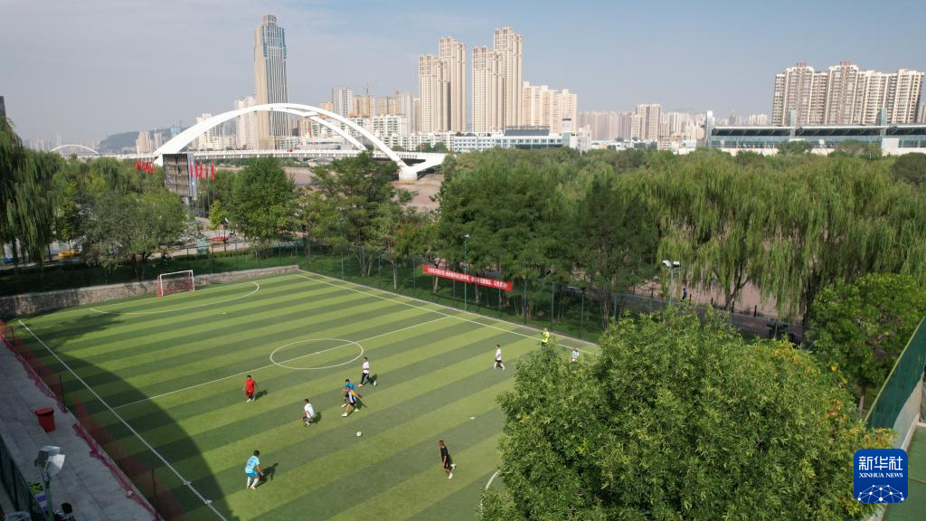 市民在位于黃河蘭州段南岸的體育公園足球場(chǎng)內(nèi)踢球(9月24日攝,無人機(jī)照片)。新華社記者陳斌攝