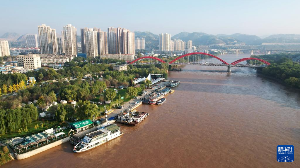 這是位于蘭州市城關(guān)區(qū)黃河北岸的鹽場(chǎng)堡碼頭(10月17日攝,無人機(jī)照片)。新華社記者陳斌攝