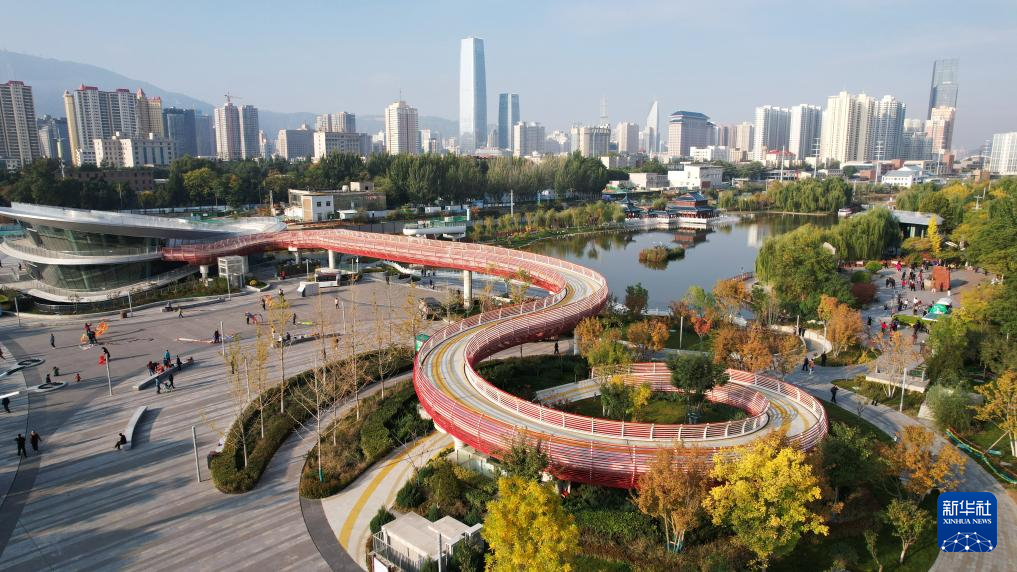 這是位于蘭州市城關(guān)區(qū)黃河岸邊的雁灘公園(10月17日攝,無人機(jī)照片)。新華社記者陳斌攝