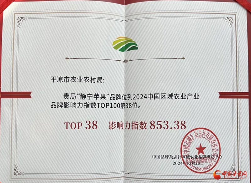 中國甘肅網(wǎng)12月25日訊(西北角·中國甘肅網(wǎng)記者 孫珩力 通訊員 胡繼萬)近日,由《中國品牌》雜志、中國品牌網(wǎng)主辦的2024區(qū)域農(nóng)業(yè)品牌年度盛典在浙江金華舉行。會(huì)上,“靜寧蘋果”品牌榮登2024中國區(qū)域農(nóng)業(yè)產(chǎn)業(yè)品牌影響力指數(shù)百強(qiáng)榜。