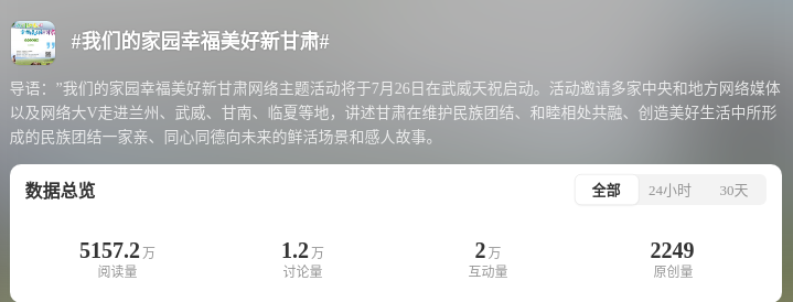 為深化互動(dòng)引導(dǎo),打造高流量IP,@甘肅網(wǎng)信、@快看甘肅等官方賬號(hào)發(fā)起社交平臺(tái)互動(dòng)話題#我們的家園幸福美好新甘肅#。結(jié)合#厚道甘肅##萬千氣象看甘肅#等話題,@中新觀隴、@中國甘肅網(wǎng)、@甘肅好網(wǎng)民、@蘭州新區(qū)發(fā)布、@甘南融媒等賬號(hào)同步發(fā)力、同頻共振。目前,該話題總閱讀量超5530萬人次,討論互動(dòng)量3.2萬人次。