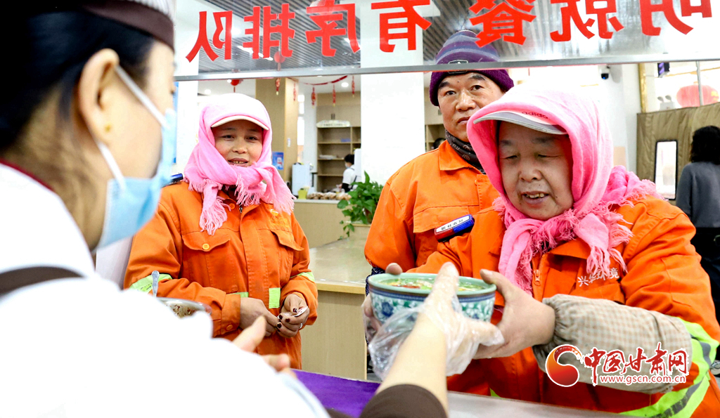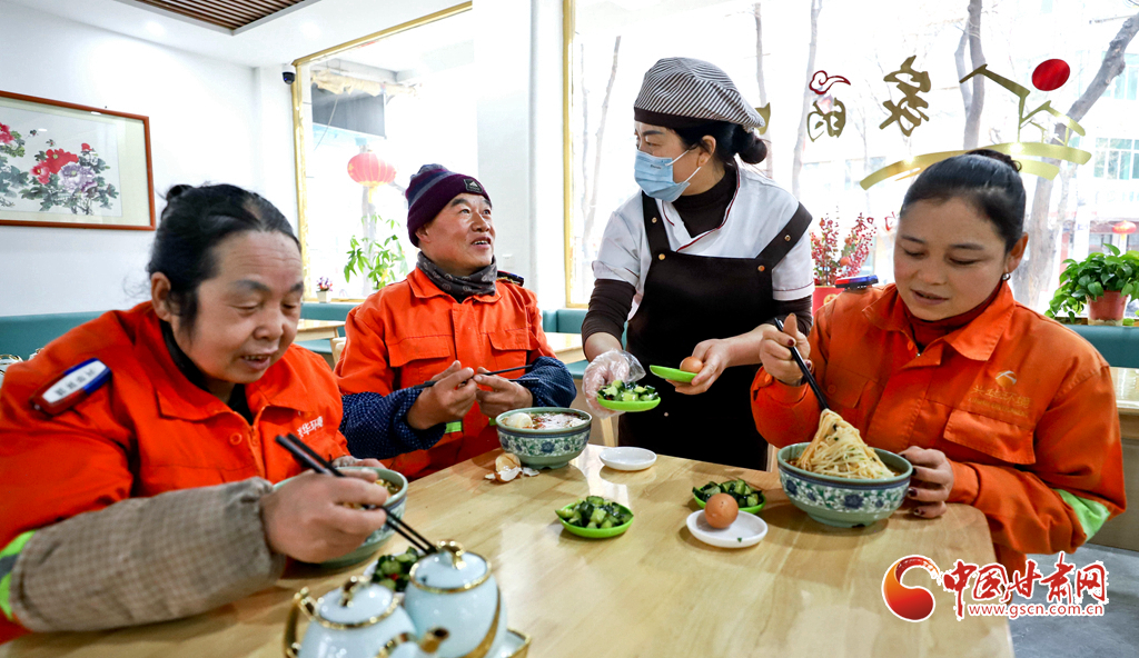 1月29日清晨,張掖市臨澤縣樂民愛心餐廳內(nèi),剛剛結(jié)束清掃的環(huán)衛(wèi)工人們圍坐在一起,吃著熱騰騰的大肉面,勞作的疲憊與清晨的寒意漸漸消散。