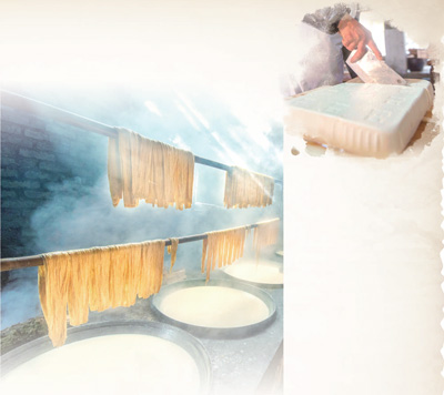 農(nóng)家豆腐講究口感,個(gè)頭飽滿(mǎn)的土黃豆,清冽甘甜的山泉水,酸度適中的漿水湯,農(nóng)家傳統(tǒng)的柴火灶,是必不可少的四件料。缺一樣,山野豆子就不能在清水中爆裂出植物的原香,沸騰的豆?jié){就開(kāi)不出雪白的豆花兒。