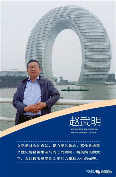 趙武明,曾用筆名丹心、牧星等。金城文化名家、青年作家、評論家、網(wǎng)絡文學研究專家、編劇、紀錄片策劃撰稿人、資深媒體人。中國散文學會會員、中華散文網(wǎng)創(chuàng)作委員會副主席、甘肅省網(wǎng)絡作協(xié)副主席,甘肅省八駿文藝人才研究會副秘書長兼文學委員會主任等,曾在魯迅文學院中青年作家班學習。在多家報刊雜志網(wǎng)絡開設專欄。發(fā)表各類文學作品數(shù)百萬字,曾獲國內(nèi)外多項文學大獎及新聞獎,擔任國內(nèi)多項文學大賽評委。唯美散文作家代表。部分作品被選入各種文集,并被設計成中高考閱讀試題。