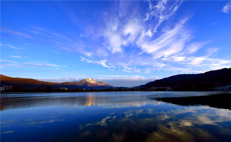我是被亮光驚醒的。我和很多水從象山腳下的黑龍?zhí)睹俺鰜怼9具艘宦暦纤???匆姾芏嗖煌拥娜恕:陬^發(fā)的人,黃頭發(fā)的人。黑眼睛的人,藍眼睛的人。我看見了潭邊的亭臺樓閣??匆娏嘶ㄅc樹。我還順著人們遠眺的目光看見了玉龍雪山,晶瑩奪目矗立在藍天下面。潭水映照雪山,真讓人目眩神迷啊。人們在橋上,在堤上,說著不同的語言。在不同的語言里,都有那個詞頻頻出現(xiàn):麗江,麗江。這時的麗江已經(jīng)是一座很大的城了。城里也不是只有最初筑城的納西人了。如今全中國全世界的人都要來麗江,看納西古城的四方街,看玉龍雪山。