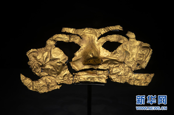 位于四川省廣漢市的三星堆博物館拍攝的出土于三星堆1號(hào)“祭祀坑”的金面罩。新華社