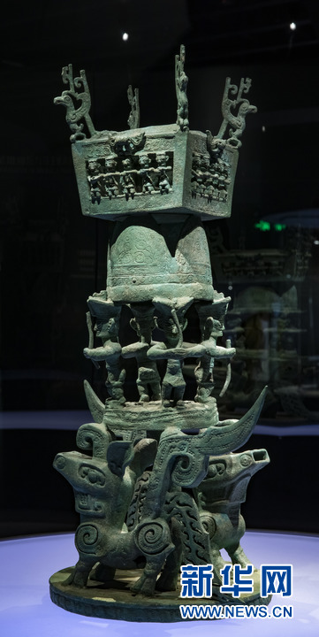 位于四川省廣漢市的三星堆博物館拍攝的出土于三星堆2號(hào)“祭祀坑”的青銅神壇。新華社發(fā)