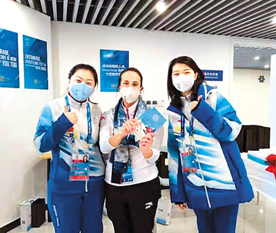 來(lái)自北京語(yǔ)言大學(xué)的志愿者向國(guó)際奧委會(huì)官員(中)贈(zèng)送《冬奧會(huì)交際漢語(yǔ)口袋書》。