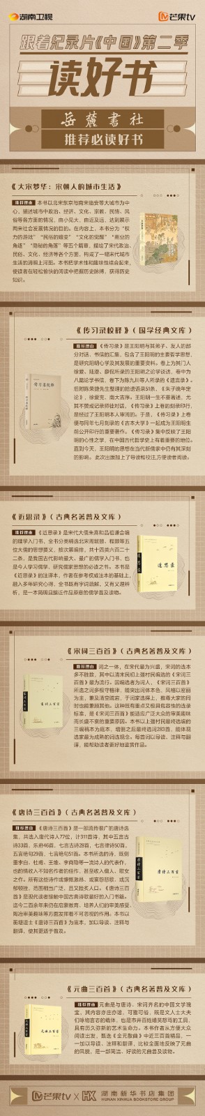 芒果TV以紀(jì)錄片《中國》第二季的精美品質(zhì),聯(lián)合湖南新華書店集團(tuán)的美譽(yù)口碑,將中華書局、上海古籍出版社、岳麓書社推薦的珍品好書,傾情向大眾推薦。本次“跟著紀(jì)錄片《中國》第二季讀好書”活動,將從2月28日持續(xù)到3月15日,湖南新華書店集團(tuán)旗下湖南圖書城、不吝Boolink書店、全省市級中心門店、長沙地區(qū)樂之書店等全員參與,推薦紀(jì)錄片《中國》第二季。書友及觀眾可登錄微博或到線下門店打卡參與活動。