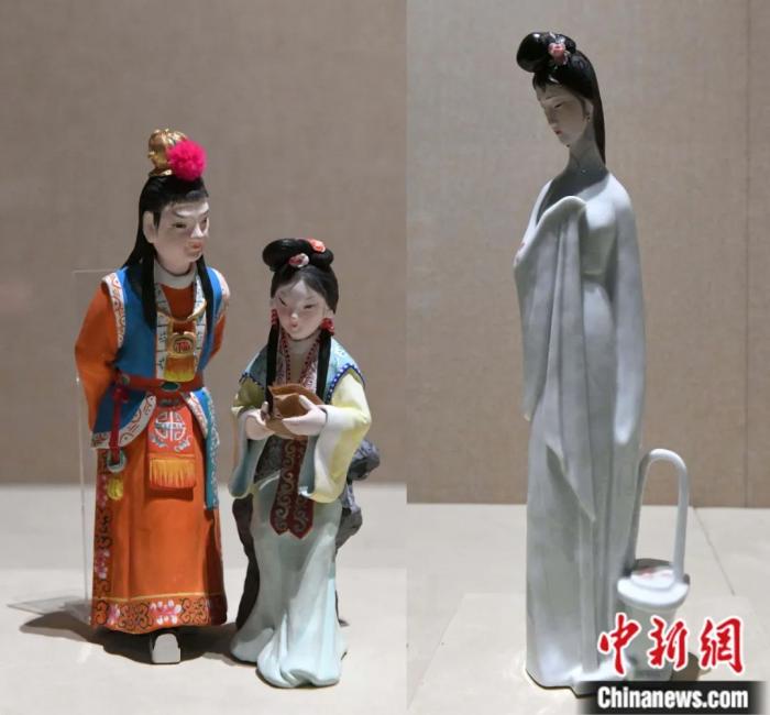 紅樓夢題材泥塑《讀西廂》和瓷塑《黛玉葬花》。中新社發(fā) 許建梅 攝