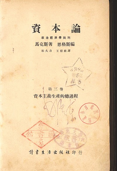 人大圖書館還藏有郭大力、王亞南翻譯的中國首個(gè)《資本論》全譯本的初印本。這是毛澤東同志贈(zèng)送的,封面鈐有“毛澤東”簽名章。