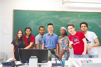 洪桐懷(左四)在北京語(yǔ)言大學(xué)的教室中和來(lái)華留學(xué)生合影。
