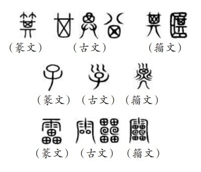(五)所謂“9353”,指的是《說文》所收全部正篆,即《說文》分析解釋的全部字?!墩f文》收字以篆文為“正”,作為標準字體,這就是許慎所說的“今敘篆文,合以古籀”的收字原則。“今敘篆文”,就是以篆文(小篆)作為標準正字,同時也會根據(jù)需要收列部分古文和籀文。《說文》所謂“古文”主要是孔子壁中書和民間所獻古文經(jīng)所用的文字,“籀文”即傳為西周晚期太史籀所編字書《史籀篇》上的文字。從《說文》來看,收入的古文、籀文,主要是與篆文有明顯差異的字形。如篆文“箕”“子”“雷”下所收列的古文、籀文: