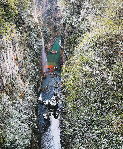 雪花飄飄,沿棧道往下走,山林被染成一幅黑白山水畫。風(fēng)雨橋在地縫之上凌空飛舞,仿佛是通往地心的鑰匙。約75米深的云龍絕壁垂直下切,狹長,呈U型,崖壁皺紋黑灰,宛若剛出鞘的寶劍閃著寒光。底下是云龍河,水淺,清澈,叮叮咚咚,增添些許歡快,而讓地縫變得富有激情的是沐撫盆地流出的7條瀑布,其中最美的是五彩黃龍瀑布。瀑布從60米高的峭壁跌落下來,纖細,飄灑,婀娜。“銀花下散布水臺,混沌鑿破山根隈。”從暗河流出的水含黃鐵礦,把巖壁和卵石刷洗得斑斕,連河水也變得絢麗。