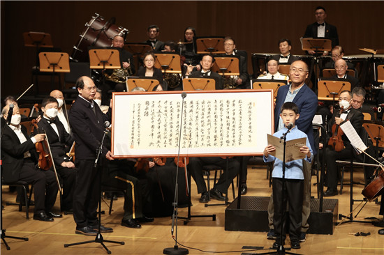 2月23日,北京,“前哲垂范 文津日新”——梁?jiǎn)⒊Q辰150周年紀(jì)念配樂(lè)朗誦音樂(lè)沙龍?jiān)趪?guó)家圖書(shū)館舉行。中國(guó)國(guó)家圖書(shū)館館長(zhǎng)熊遠(yuǎn)明(左)向梁?jiǎn)⒊笕速?zèng)手書(shū)《少年中國(guó)說(shuō)》。 蔣啟明/攝