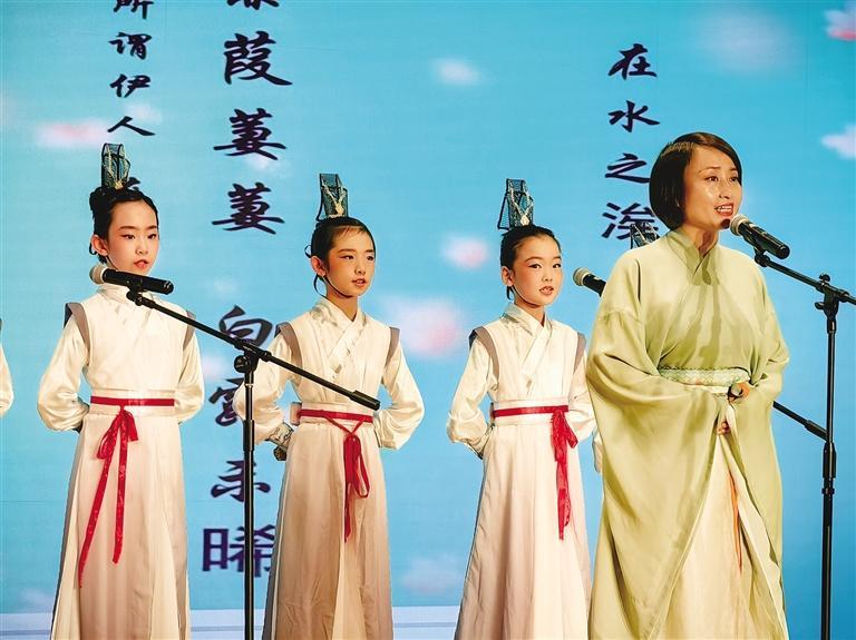 在《壯美山河絢麗詩(shī)篇》中,《詩(shī)經(jīng)·秦風(fēng)·蒹葭》在蘭州市東郊學(xué)校曹林老師和方培丞等12位小朋友的演繹下,古風(fēng)古韻氣息撲面而來。