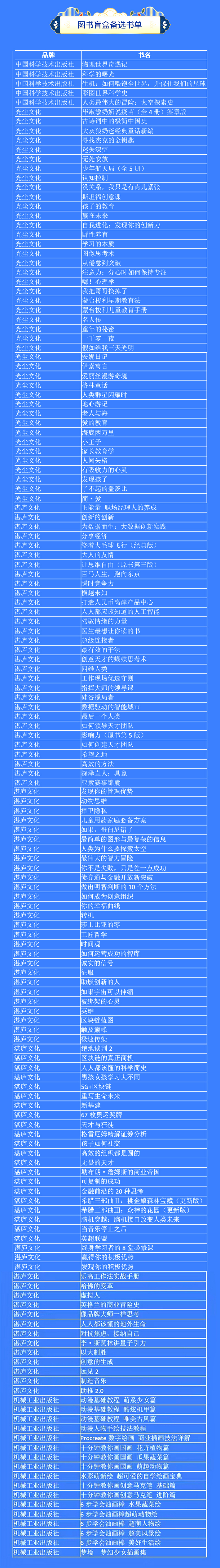 本次活動由新華云商聯(lián)合機械工業(yè)出版社、中國科學(xué)技術(shù)出版社、光塵文化、湛廬文化共同推出。盲盒內(nèi)圖書涵蓋經(jīng)管技術(shù)類、歷史人文類、心理健康類等品類,將隨機搭配三本,可能與您的藏書重復(fù),或不符合您的閱讀愛好,請您慎重選擇理性購買。同時,盲盒內(nèi)會附贈新華網(wǎng)文創(chuàng)徽章或書簽。
