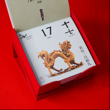 如意取出第一層里紅紅的燙金書刊盒,馬上發(fā)現(xiàn)了它的小機(jī)關(guān):原來盒蓋上有個(gè)吸鐵石,把它翻過來,就可以25度傾斜地放在書桌上,舒服地翻閱一整年的“日子”;每一天的頁面都能被絲滑地撕下,作為小書簽,插在課本讀物中。