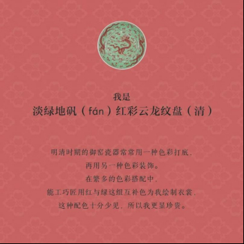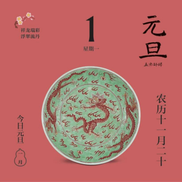 翻開新年伊始的“元旦”頁,映入眼簾的是一個(gè)綠色的盤子,上面有三條雄勁矯健的“龍爺爺”,它們來自清代吧!如意輕輕撕下日歷頁翻到反面,讀起文物小故事:“我是淡綠地礬(fán)紅彩云龍紋盤……”