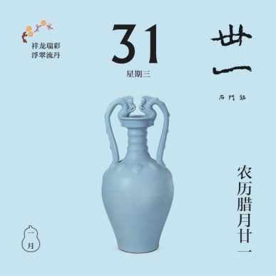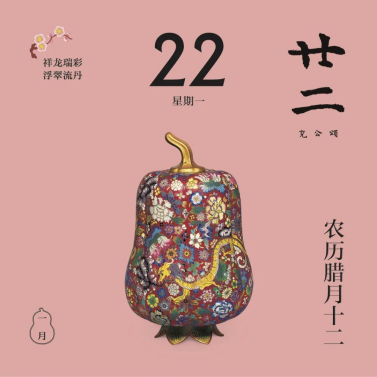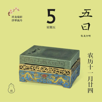 翻開1月月份頁,首先跳入眼簾的,是主題詞“祥龍瑞彩”。這個(gè)月以絢麗的顏色為主線,串起各色龍文物,比如精致的宋代單色釉龍紋盤,絢麗的故宮官式建筑和璽彩畫,還有優(yōu)雅的清代掐絲琺瑯游龍花卉紋瓜式蓋罐……