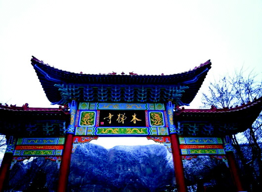 “素練披新山,銀樹列白川。”冬日的木梯寺被陣陣寒意包圍,顯得更加厚重。彩色牌樓挺立在白茫茫的山間,被襯托得分外鮮艷,“木梯寺”三個(gè)大字雄宏大氣,配合著這壯觀的景色,琉璃瓦下綴著水晶冰柱,像俏皮的小尾巴,為這幅水墨畫更增添了幾分頑皮。