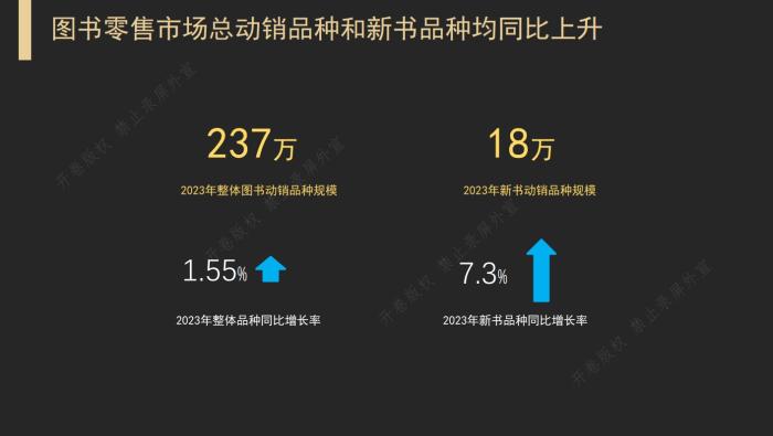上述《報(bào)告》顯示,2023年整體零售市場(chǎng)總動(dòng)銷品種達(dá)237萬(wàn)種,同比上升1.55%,動(dòng)銷新書品種達(dá)18萬(wàn)種,同比上升7.3%。