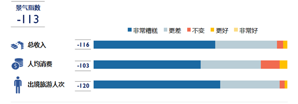 《報告》指出,受疫情影響,從業(yè)者對2020年上半年出境旅游市場的整體業(yè)績預期極為悲觀。與去年同期相比,景氣指數大跌113個指數點,至-113。同時,出境旅游人次、人均消費及總收入三項指標的市場預期較2019年上半年均有大幅下滑,其中受疫情于全球蔓延的影響,從業(yè)者對出境旅游人次的預期負面性最高。