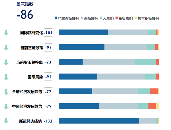 整體而言,從業(yè)者預期以上7項因素均將對2020年上半年出境旅游市場業(yè)績產生負面影響,導致整體景氣指數下降至-86。其中,正于全球蔓延的新冠疫情被認為是限制出境旅游市場發(fā)展的最主要因素。