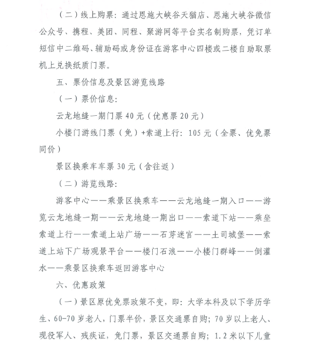 優(yōu)惠政策方面,景區(qū)原優(yōu)免票政策不變;與此同時(shí),全國醫(yī)護(hù)人員、援鄂醫(yī)療隊(duì)員、天津援助恩施醫(yī)療隊(duì)員按湖北省文旅廳、恩施市文旅局相關(guān)優(yōu)惠政策(憑有效證件)免門票;天津市民憑有效證件享受門票半價(jià)。