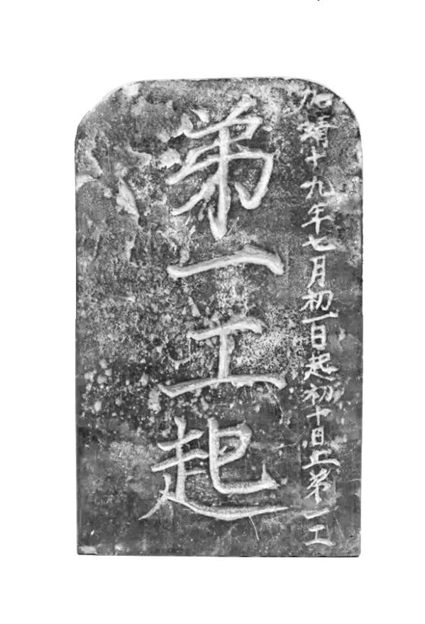 這塊“長城工牌”,高19厘米,寬11.5厘米,厚2厘米。兩面陰刻楷書,共58字,正面豎刻兩行字,共22字,正中刻“弟一工起”四個(gè)大字,右邊刻“加靖十九年七月初一日起初十日止第一工”一行小字;背面文字分上下兩部分,共36字。上部刻四個(gè)大字“蔡止梅起”。下部豎刻六行32個(gè)小字“一工李清隊(duì)起,二工梅喜隊(duì),三工王元隊(duì),四工侯勛隊(duì),五工位宗隊(duì),六工張曇隊(duì)止”。
