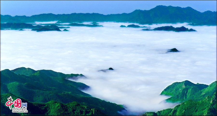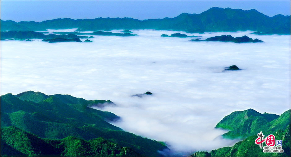 暖濕空氣上升到一定高度,遇冷凝結(jié)成云霧,形成霧靈山變幻莫測、波瀾壯闊的霧靈云海。云海在無風(fēng)之際是出奇的平靜,輕風(fēng)吹過,濺起層層浪花。風(fēng)勢稍強,便似波濤洶涌,又如萬馬奔騰,置身山巔,神思飛越,浮想聯(lián)翩,仿佛進(jìn)入夢幻世界。站在頂峰遠(yuǎn)眺,山巒在云海中出沒無常,宛若大海中的無數(shù)島嶼,時隱時現(xiàn),似真似幻,使人感到一種神奇縹緲的仙境般的美。云海中的景物若隱若現(xiàn),虛虛實實,令觀者捉摸不定,于是產(chǎn)生幽邃、神秘、玄妙之感,給人一種朦朧的美。從美學(xué)角度觀察,霧靈云海妙在似海非海,非海似海。其潔白云霧的飄蕩,使霧靈山呈現(xiàn)出靜中寓動的美感。正是在這種動靜結(jié)合之中,造化出變幻莫測,氣象萬千的人間仙境。